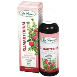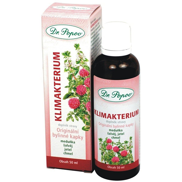 Originální bylinné kapky Dr. Popova Klimakterium obsahují meduňku a šalvěj, které přispívají k hormonální rovnováze a jetel s chmelem pro udržení komfortu v období menopauzy.
