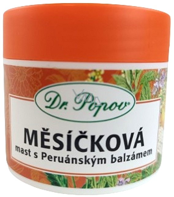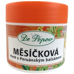 Měsíčková mast s Peruánským balzámem Dr. Popova – osvědčená mast k regeneraci podrážděné pleti, jizev, otlaků, mozolů a zhrublé pokožky. Dobře působí při masáži unavených nohou a jako masážní prsní dětská mast. Obsahuje pověstný Peruánský balzám, pro své vynikající regenerační vlastnosti vysoce ceněný v Jižní Americe.
