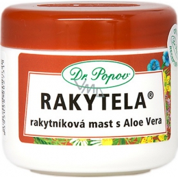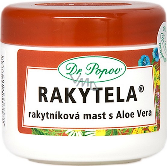 Rakytela – rakytnikowa maść z Aloe Vera Dr. Popova jest wysoce skuteczną maścią do codziennej pielęgnacji skóry. Łagodzi, nawilża i regeneruje normalną i suchą skórę, doskonała do ograniczenia powstawania zmarszczek. Zawiera wysokiej jakości Aloe Vera żel do nawilżania i odżywiania skóry. Olej z rakytnika ma regeneracyjne i epitelizacyjne działanie, dzięki czemu Rakytela jest również odpowiednia do pielęgnacji blizn, oparzeń i odmrożeń. Użyty olej z rakytnika (zawiera witaminy i niezbędne kwasy tłuszczowe) ma regeneracyjne i epitelizacyjne działanie, dlatego możesz maść z rakytnika dobrze wykorzystać do pielęgnacji blizn, oparzeń i odmrożeń. Maść ma przeciwzapalne i antybakteryjne działanie i może chronić uszkodzoną skórę. Maść rakytnikowa jest idealna do codziennego użytku. Należy do znanych, a zarazem bardzo użytecznych maści.