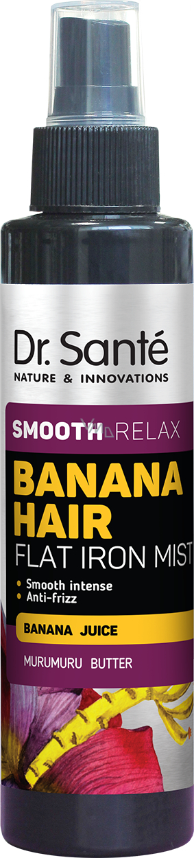 Spray Dr. Santé Smooth Relax Banana Hair jest przeznaczony do pielęgnacji puszących się włosów, które potrzebują intensywnego wygładzenia. Unikalny skład zawiera cenne składniki rekonstruujące, takie jak na przykład hydrolizowane keratyny, superżywność z bananowej skórki lub olej murumuru, włosy odżywia, nawilża i doskonale wygładza ich powierzchnię. Dzięki temu jest zapewniona jak najlepsza aktywna pielęgnacja włosów i skóry głowy.