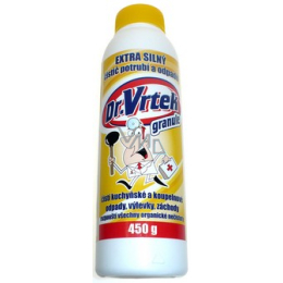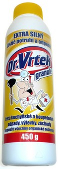 2) Do sifonu umyvadla, vany, sprchového koutu nalijte 1/4 l horké vody a následně nasypte cca. 5 minut 100 g Dr. Vrtka - čističe odpadů. Používejte k čištění vždy jen doporučené množství.