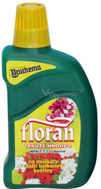 Floran Muškát je tekuté hnojivo na muškáty a další balkónové květiny. Je koncentrovaným přípravkem s vyváženým poměrem dusíku, fosforu a draslíku s obsahem bóru. Floran Muškát je vhodný pro převážnou většinu balkónových květin, zejména pro muškáty, petúnie, fuchsie, verbeny, surfi nie, lobelky i begonie, balzamíny apod. Hnojivo je též vhodné pro rostliny s pestře zbarvenými listy.