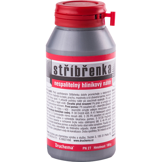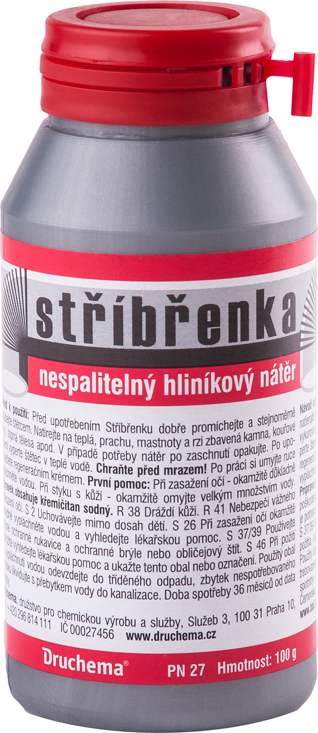 Druchema Stříbřenka ognioodporna farba służy do malowania pieców, grzejników i rur kominowych. Po wyschnięciu i wypaleniu powstaje jasna, srebrnoszara matowa powłoka. Stříbřenka jest niepalna i nietoksyczna.