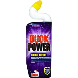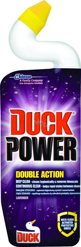 Duck Power Double Action je tekutý čistící přípravek na toalety. Vyčistí Wc mísu, odstraní vodní kámen a udržuje ji lesklou beze skvrn. Jedinečně zakřivené hrdlo láhve snadno dosáhne pod obrubu Wc mísy, kde se nejvíce vyskytují usazeniny. Dokonale čistí a zanechá svěží vůni levandule. Důkladné čistění efektivně čistí a odstraňuje vodní kámen. Nepřetržité čištění vytváří film odpuzující nečistoty.