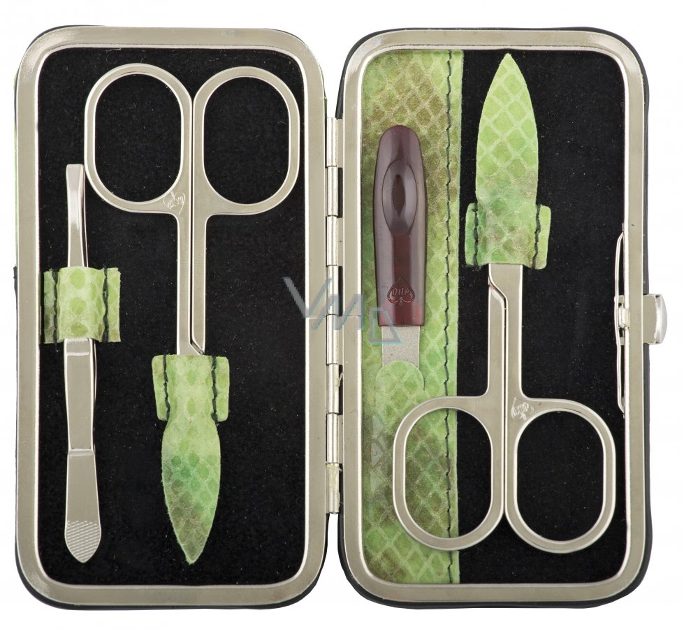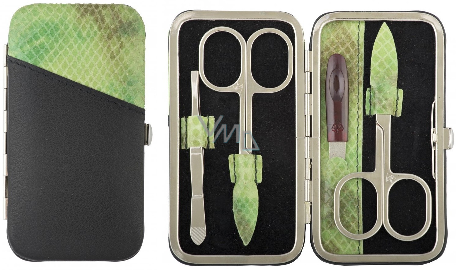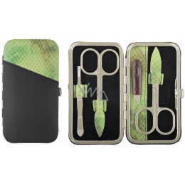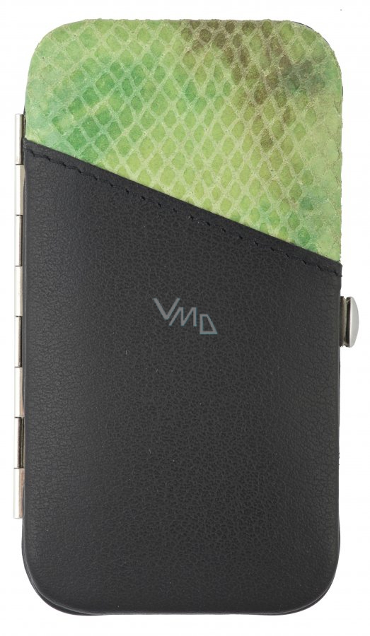 Praktická manikúra do kabelky i na cesty, vyrobena z černé a zelené hadinkové kůže, uzavíraná rámečkem.