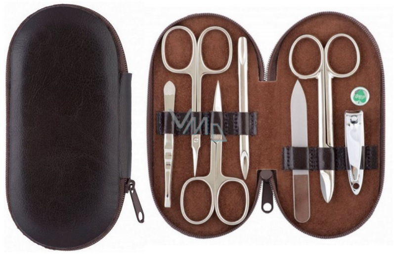 Manikúrní sada z hnědé kůže s odolným povrchem, obsahuje manikúrní nástroje značky Solingen a DUP. Manikúra se uzavírá na zip a je vhodným dárkem pro každou dámu i slečnu.