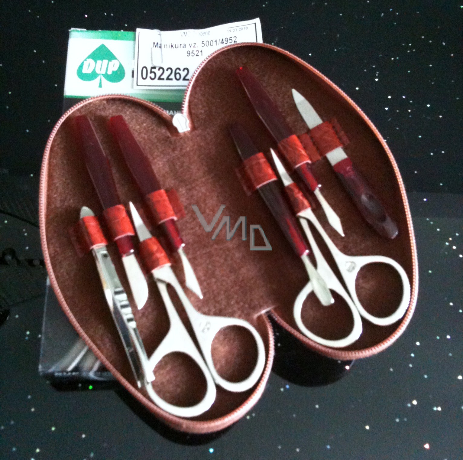 manikúra obsahuje nůžky nehtové, záděrkové, nůžkovou pinzetu, pilník, čtyři kusy manikúrovacího ná