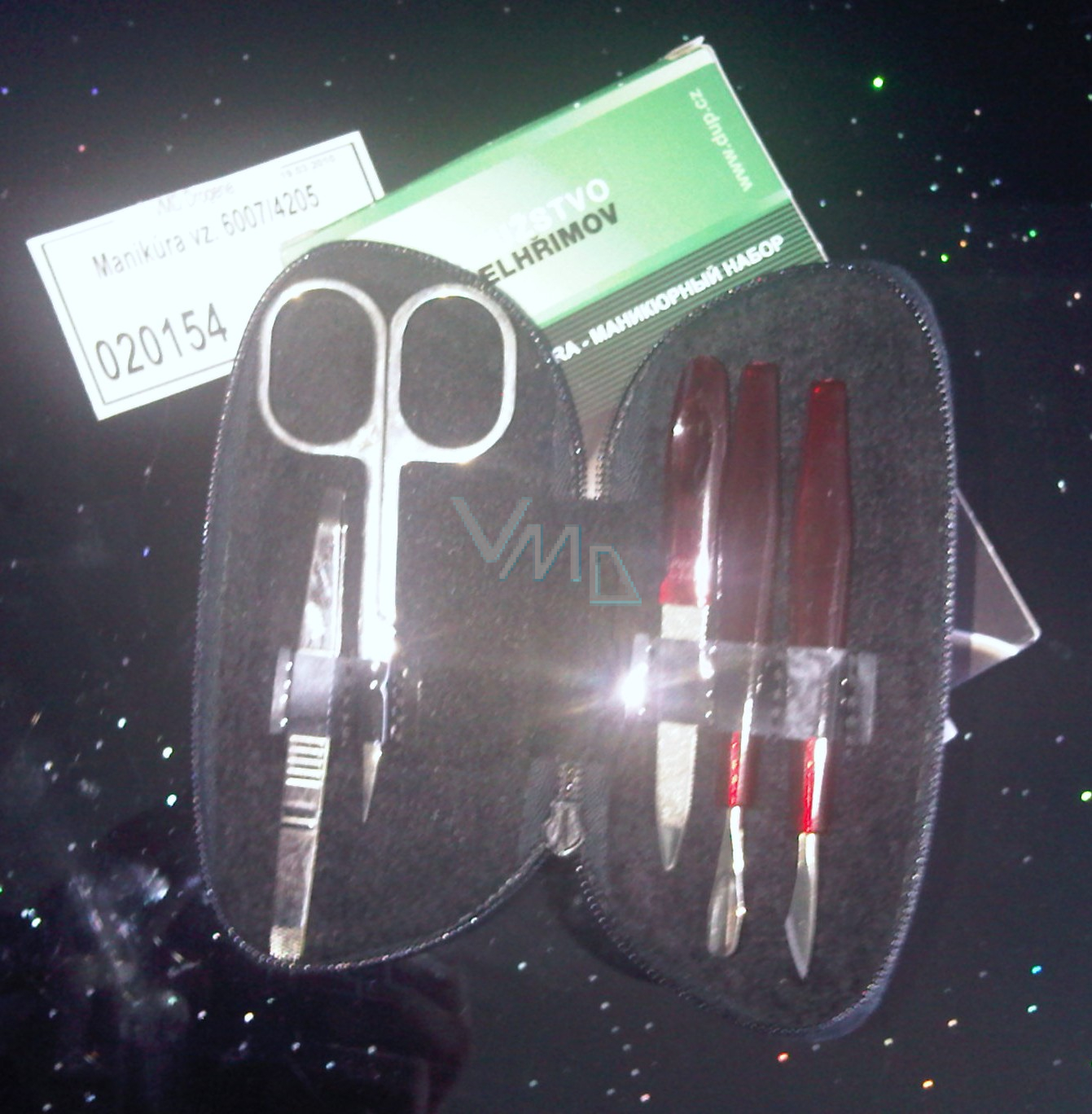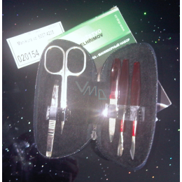Manikúra obsahuje nůžky nehtové, nůžkovou pinzetu, pilník, dva kusy manikúrovacího náčiní, uzaví