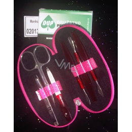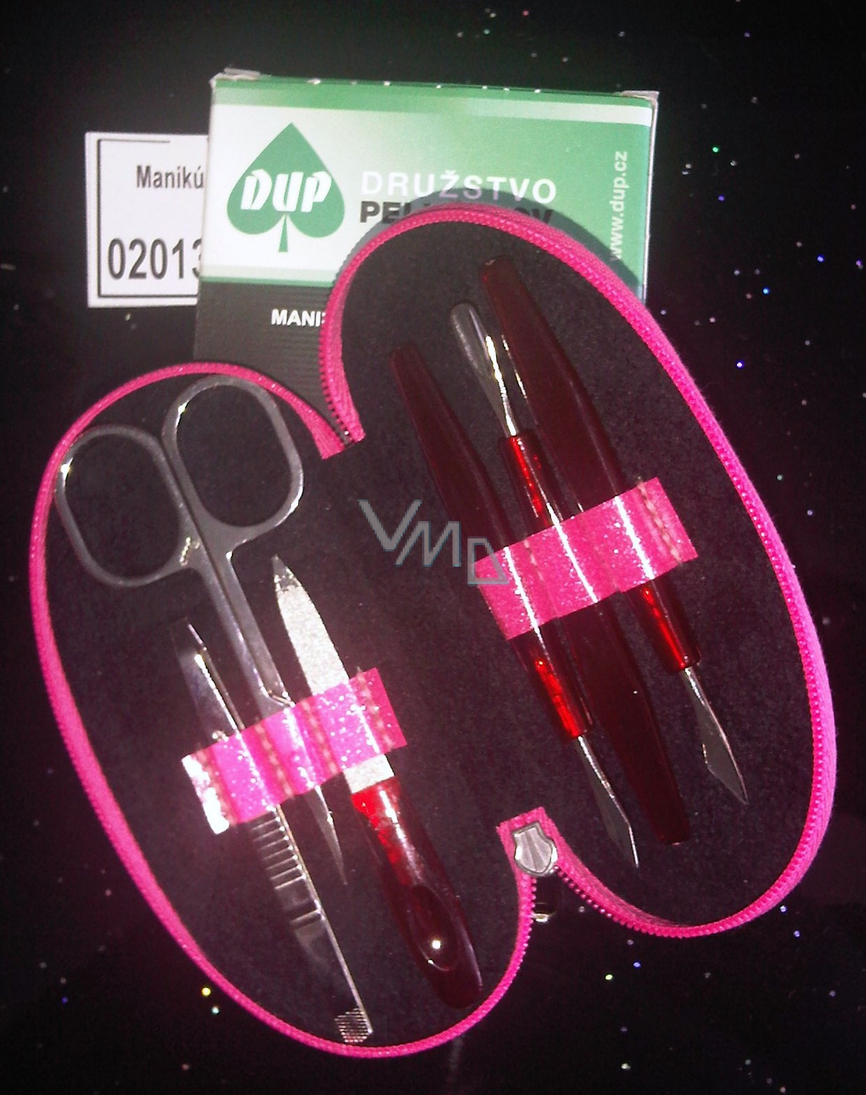 manikúra obsahuje nůžky nehtové, nůžkovou pinzetu, pilník, tři kusy manikúrovacího náčiní, uzavír