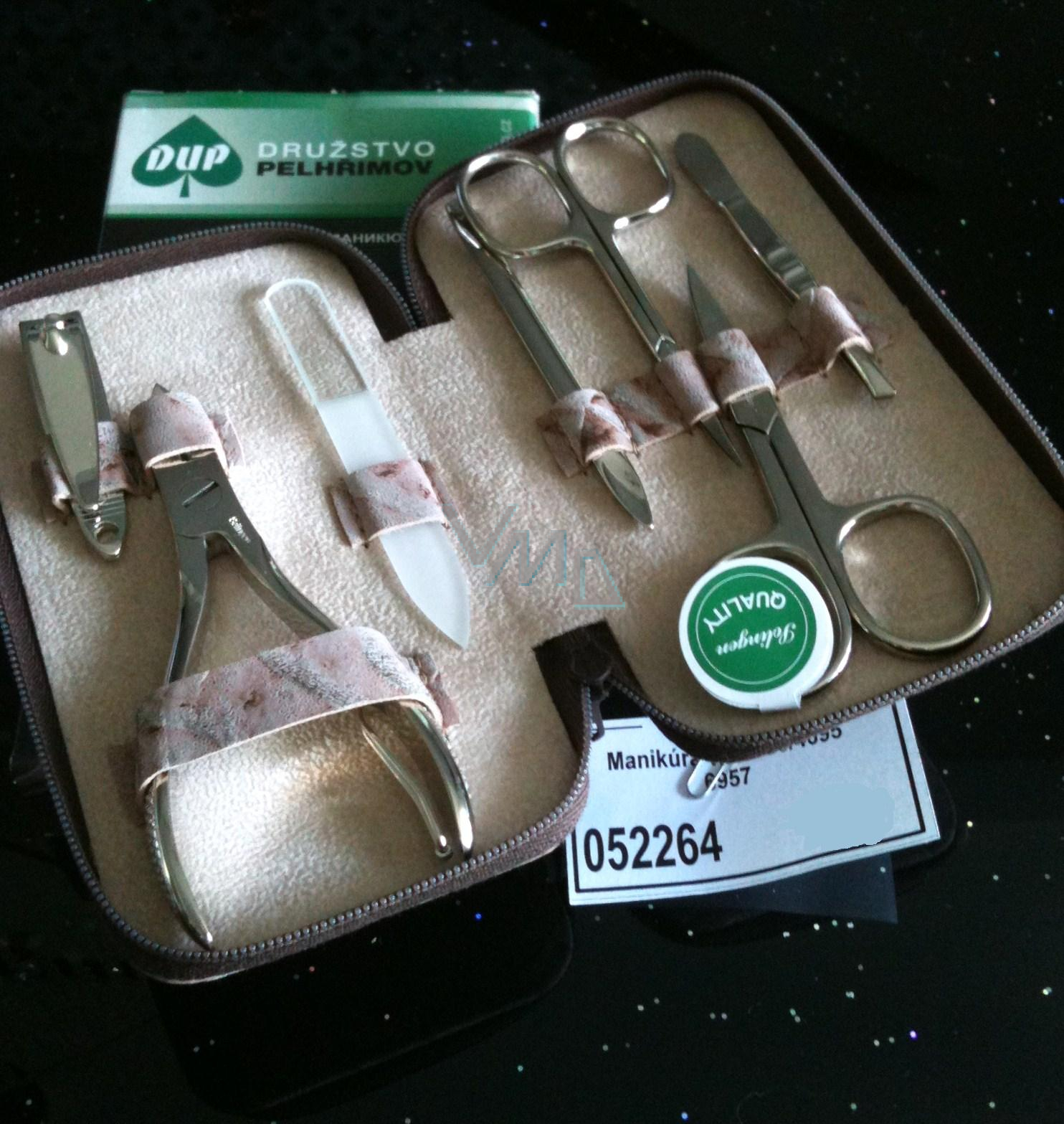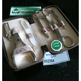 manikúra obsahuje nůžky nehtové, záděrkové, nůžkovou pinzetu, skleněný pilník, kleště a štípačku,