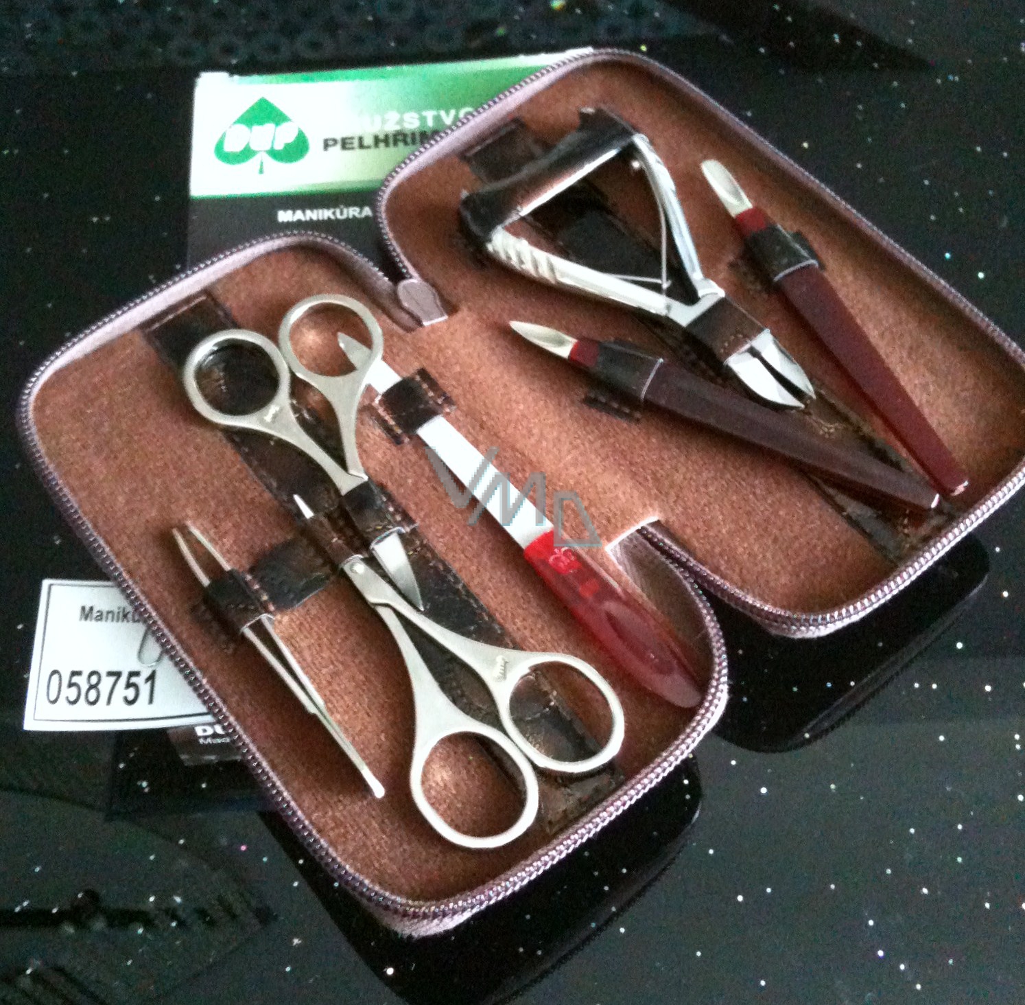 manikúra obsahuje nůžky nehtové, záděrkové, nůžkovou pinzetu, pilník, pinzetu, dva kusy manikúro