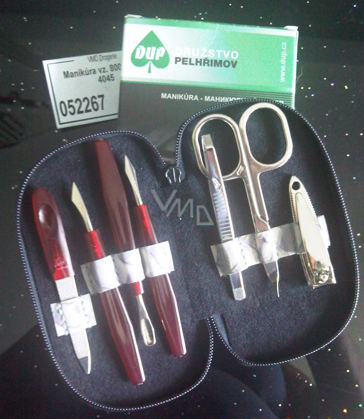 manikúra obsahuje nůžky nehtové nůžkovou pinzetu, pilník tři kusy manikúrovacího náčiní uzavírá s