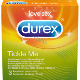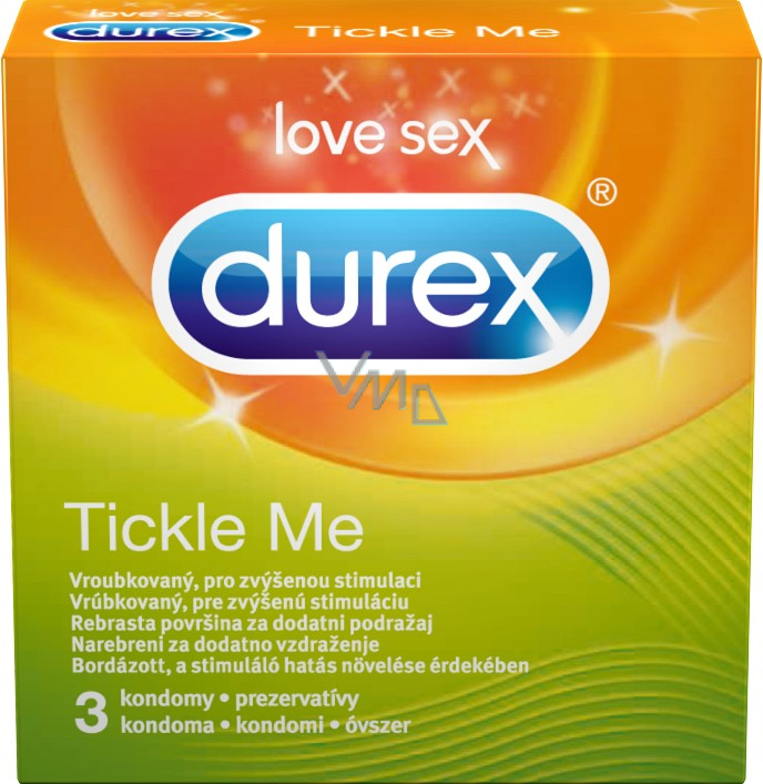 Durex Tickle Me - dříve pod názvem Arouser. Vroubkovaný kondom pro stimulaci. Rovný, zakončený rezervoárem. Lubrikované kondomy z přírodního kaučukového latexu korálové barvy.