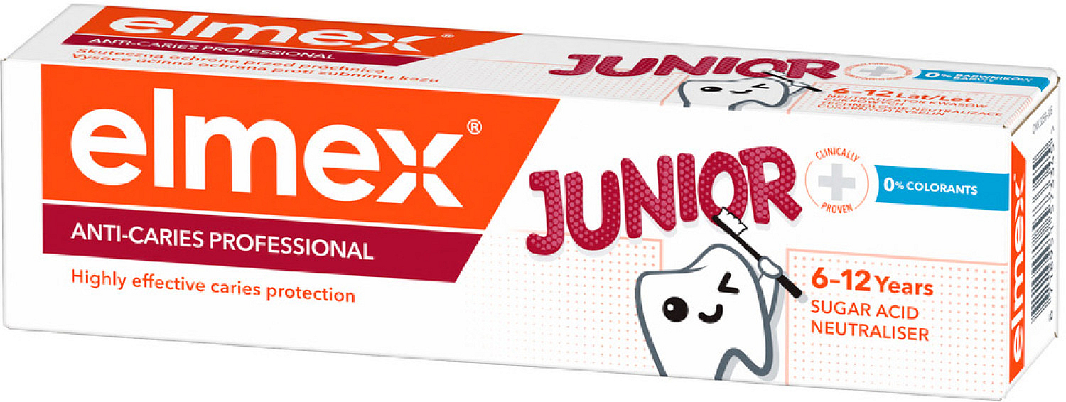 Pasta do zębów dla dzieci wspomaga remineralizację zębów dzięki technologii neutralizacji kwasów cukrowych z zawartością argininy, wapnia i fluoru. Wiele produktów spożywczych zawiera cukier, który może przekształcać się w kwasy osłabiające zęby poprzez rozpuszczanie minerałów i powodujące próchnicę. Pasta do zębów Anti-Caries Professional Junior od marki Elmex jest idealnym sposobem na ochronę zębów i jamy ustnej. Odpowiednie dla dzieci w wieku od 6 do 12 lat.