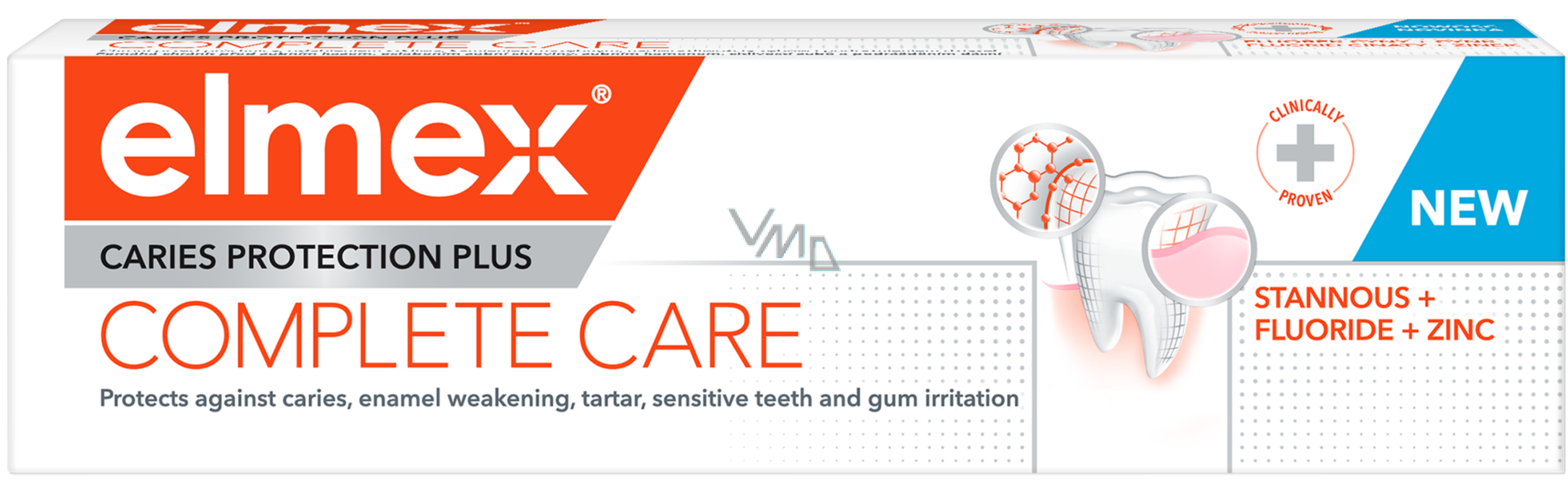 Elmex zubní pasta COMPLETE CARE je zubní pasta s obsahem fluoridu cínatého a fosforečnanu zinečnatého, která poskytuje kompletní ochranu pro zdravá ústa. Pomáhá chránit před zubním kazem, oslabením zubní skloviny, zubním kamenem, citlivostí zubů a podrážděním dásní. Pomáhá rovněž obnovovat přirozenou bělost vašich zubů. Pečujte o své zuby a ústa pomocí zubní pasty COMPLETE CARE od značky elmex!