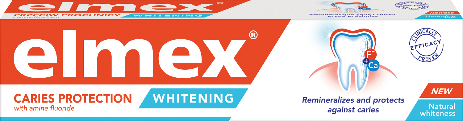 Pasta do zębów z aminofluorkiem - Specjalny składnik zapewniający skuteczną ochronę przed próchnicą. Elmex Caries Protection Whitening to idealne rozwiązanie dla wszystkich, którzy walczą z próchnicą. Jednocześnie usuwa plamy i przyczynia się do naturalnej bieli twoich zębów. Używaj dla dzieci od 7 roku życia.