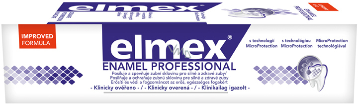 Zubní pasta Enamel Professional posiluje zubní sklovinu. Díky patentované technologii mikro ochrany představuje zubní pasta Elmex Enamel vysoce účinnou ochranu před ztrátou zubní skloviny. Pasta zároveň vytvoří na povrchu zubní skloviny ochrannou vrstvu, která chrání zuby před působením kyselého prostředí. Obsažené amnifluoridy (1400ppm) chrání před vznikem zubního kazu.