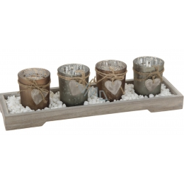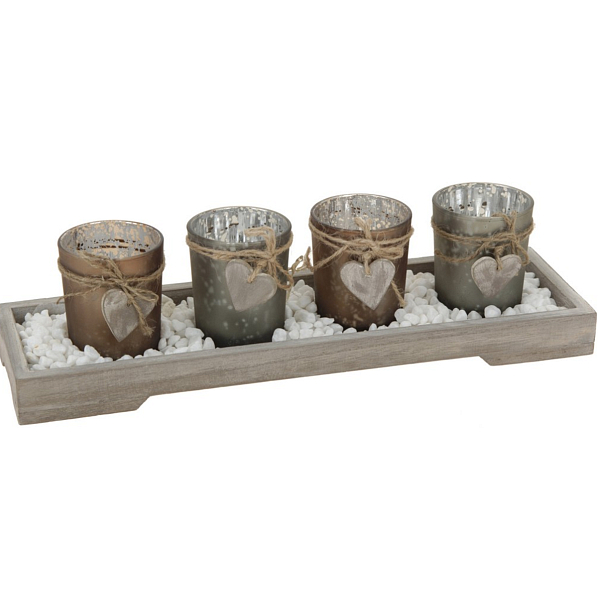 Skleněný svícen na dřevěném tácku s kamínky na 4 kusy čajových svíček. Krásný adventní svícen. Kdo je připraven, není překvapen. Určitě to znáte. Ne jinak je to i v případě vánočních dekorací. Vánočních ozdob není nikdy dost!