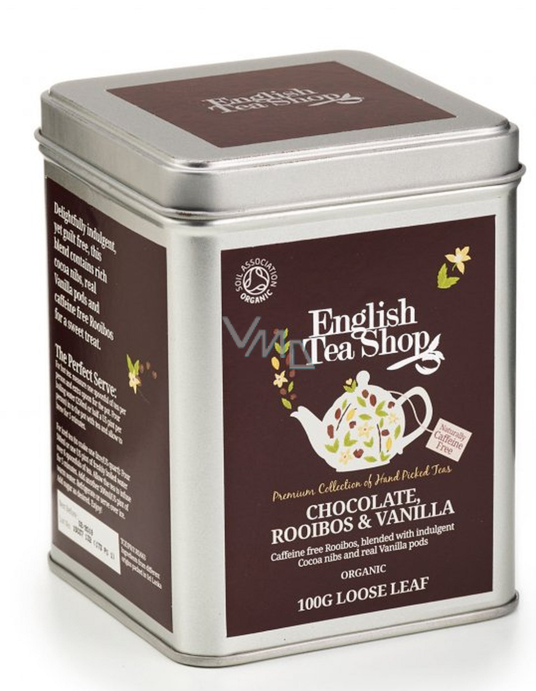 Sypaný čaj Rooibos, čokoláda a vanilka v bio kvalitě od značky English Tea Shop vás překvapí sladce karamelovou chutí, která je přirozeně bez teinu. Díky tomu je ideální pro těhotné a kojící ženy a děti. Rooibos neboli červený čaj je zcela bez kofeinu a má zklidňující účinky. Díky obsahu antioxidantů zpomaluje stárnutí organismu i pokožky. Zabraňuje tvorbě vrásek a ztrátě elasticity, dále urychluje spalování tuků a působí proti stresu, úzkostem a nespavosti.