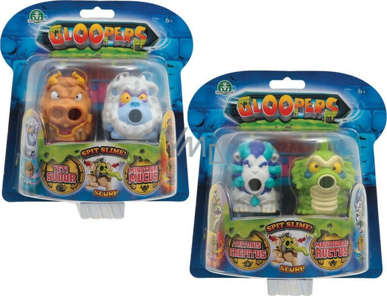 Toto jsou Gloopers, příšerky, které vcucnou snad každý sliz, na který zrovna narazí. A umí ho taky pěkně plivat kolem sebe. Zmáčkněte figurku a nasajte sliz příslušným otvorem na ústech nebo nosu. Pak figurku opět zmáčkněte a PLIV….. sliz je zase venku. Sbírejte je a užijte si ještě více slizké zábavy. Každou figurku lze připevnit na baňku, ve které je sliz.