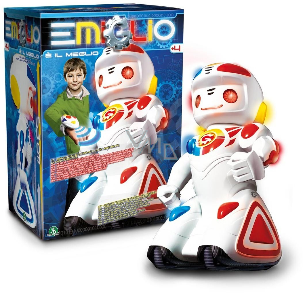 Neuvěřitelně velký, veselý a přátelský společník je robot Emiglio! Nikdy neodmlouvá a reaguje na sebemenší pohyb tvojí ruky. Velmi jednoduše se ovládá pomocí náramku, do kterého můžeš mluvit a Emiglio bude vše opakovat. Dáš mu něco na tácek a on ti to přinese, můžeš jej využívat jako číšníka. Jen si přestav, robot ti přinese svačinu. Jako správný robot je vybaven světlem. Zažiješ s ním mnoho zábavných chvil, ať budeš sám, s rodinou nebo kamarády. Oblé tvary robota a veselé barvy z něj dělají neobyčejně příjemného a milého společníka.