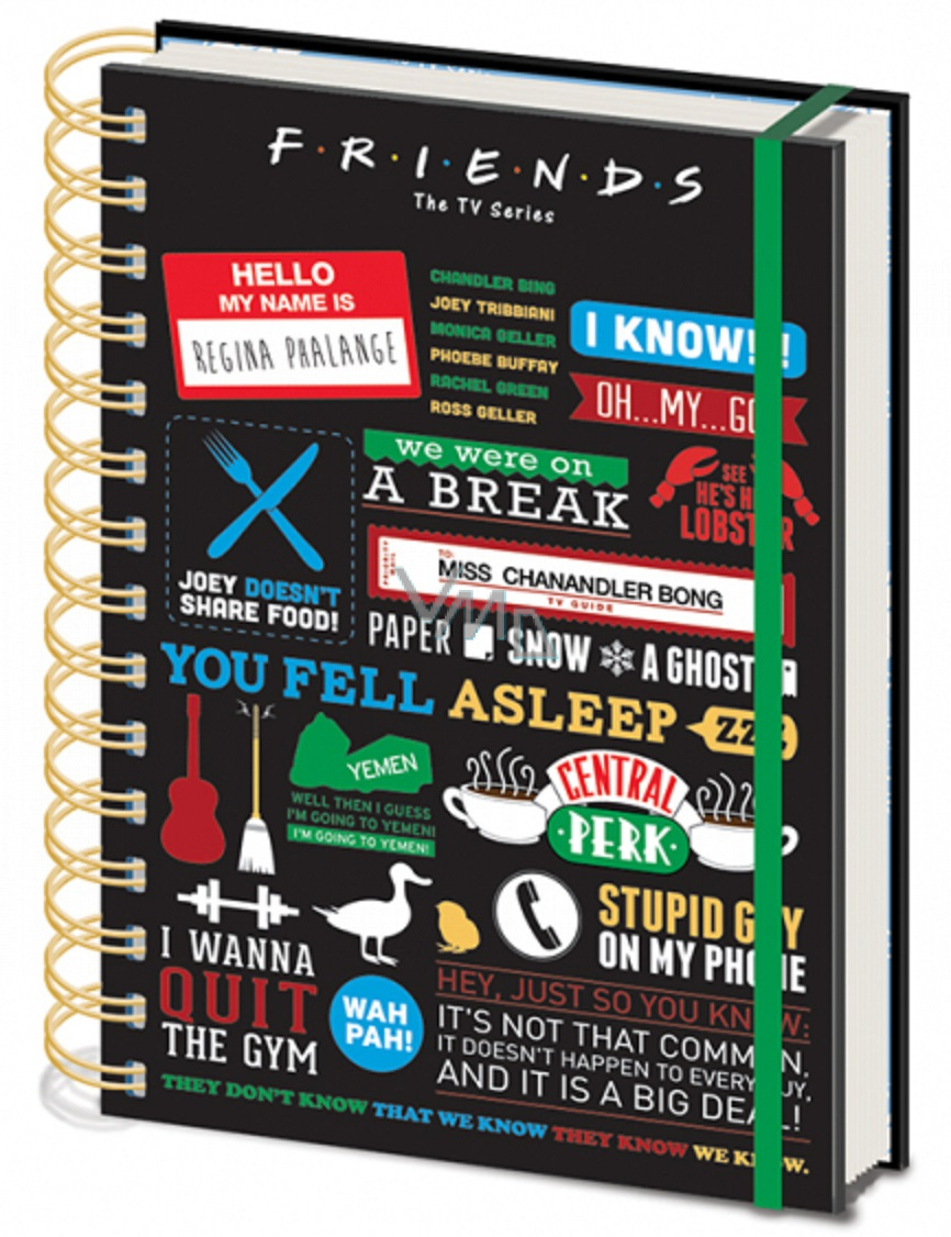 Linkovaný zápisník formátu A5 s motivy ze seriálu Friends (Přátelé). Připomeňte si známé hlášky a události ze seriálu a zapisujte své poznámky stylově!