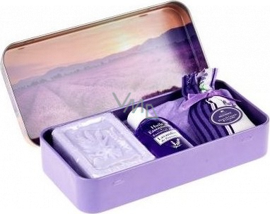 Šetrně čistící mýdlo, které zvláční vaši pokožku, vonný pytlíček a esenciální levandulový olej. To vše najdete v praktické plechové krabičce s motivem levandulového pole. Ideální na cesty nebo jako dárek, který vás zahalí do čisté vůně provensálské levandule.