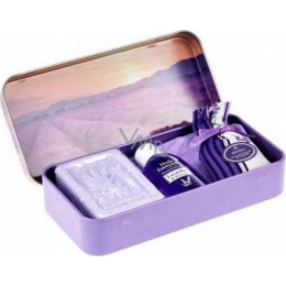 Esprit Provence Levandule toaletní mýdlo 60 g + vonný pytlík + esenciální olej 12 ml + plechová krabička s obrázkem levandulového pole, kosmetická sada pro ženy