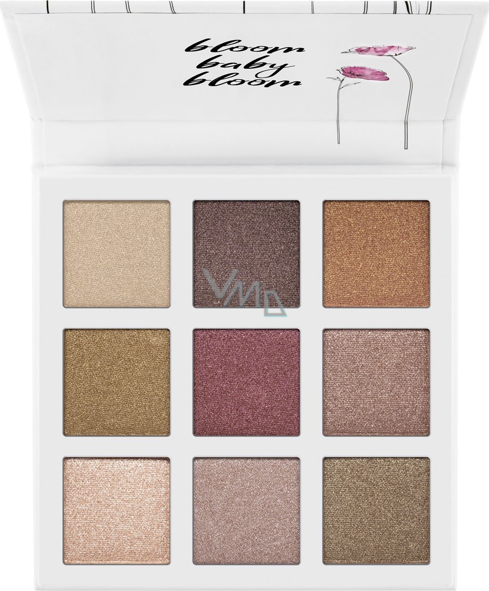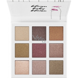 Paleta očních stínů nabízí devět třpytivých odstínů v tělových, bronzových a berry odstínech. Díky jemné textuře se odstíny dobře roztírají.