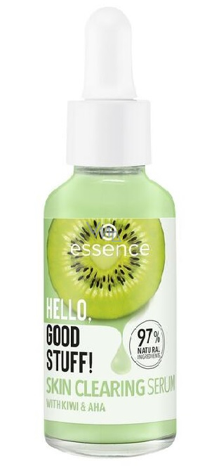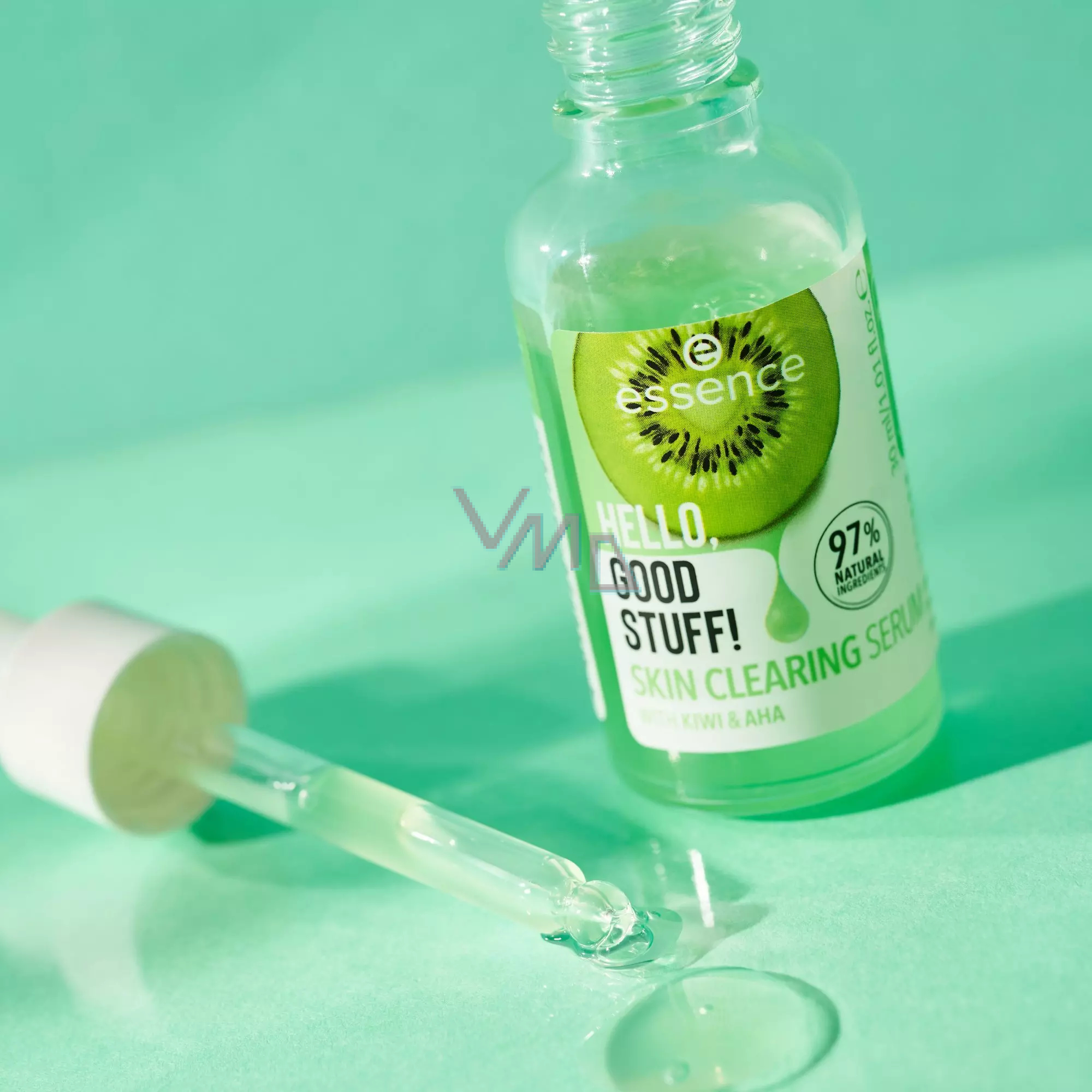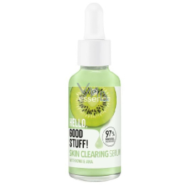 HELLO, GOOD STUFF! Serum CLEAR SKIN zawiera kwasy AHA do delikatnego działania eksfoliacyjnego, wodę z kiwi i odżywczy panthenol. Skład jest wykonany w 97 % z naturalnych składników i skóra dzięki niemu jest niezwykle gładka.