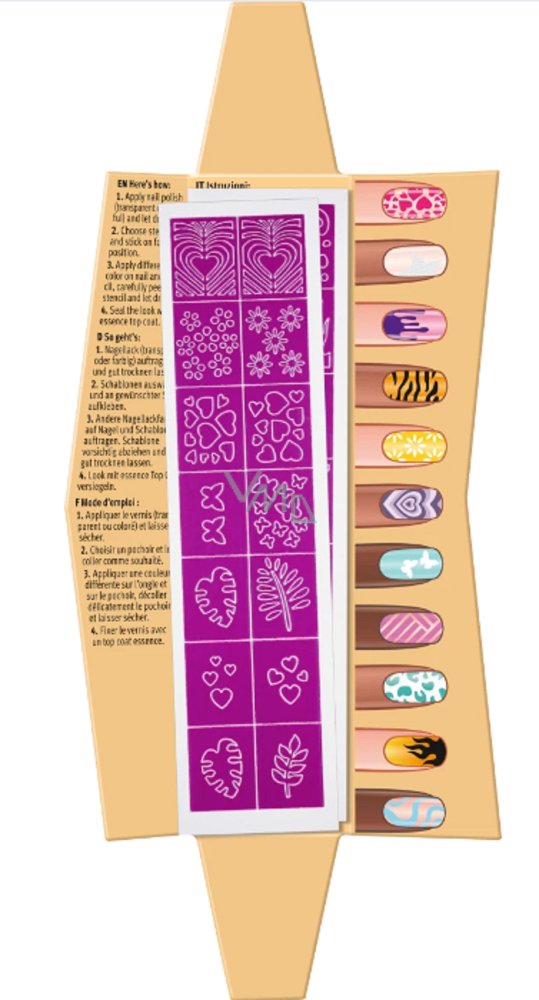 Przemień swoje paznokcie w kilka chwil z Nail Art Stencils od Essence na absolutne dzieło sztuki. Szablony pozwalają na stworzenie niezliczonych wzorów, które odpowiadają najnowszym trendom paznokciowym. Dzięki temu praktycznemu narzędziu zadowoleni będą zarówno początkujący, jak i profesjonaliści w dziedzinie stylizacji paznokci. Stwórz zachwycające i artystyczne paznokcie.