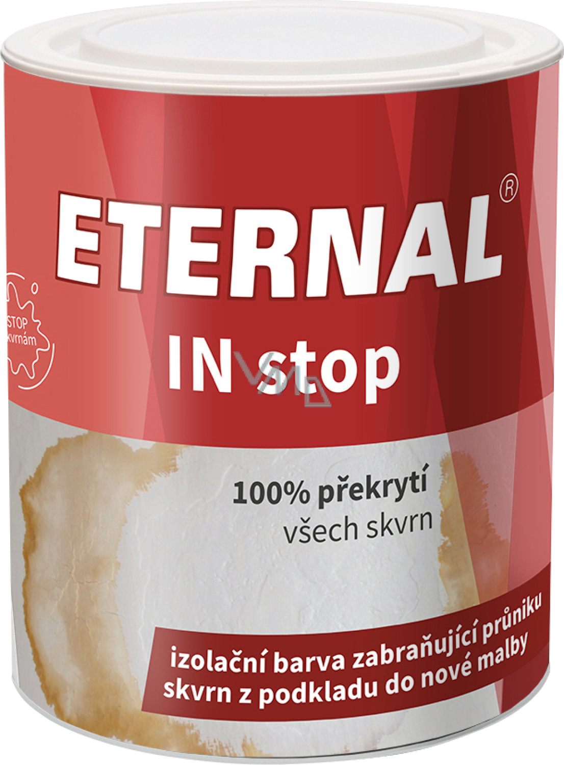 ETERNAL IN stop jest stosowany do podstawowych powłok, które mogą zapobiec przenikaniu plam nikotynowych w silnie zadymionych pomieszczeniach do nowego malowania. Ponadto za pomocą tej powłoki można izolować plamy po starych malowaniach walcowych, plamy po przeciekach, rdzy, tłuszczu, sadzy, plamy występujące z drewna, płyt wiórowych i płyt gipsowo-kartonowych podczas malowania farbami dyspersyjnymi itp. ETERNAL IN stop jest jednoskładnikową wodną masą malarską przygotowaną na bazie specjalnej wodnej dyspersji kopolimerów akrylowych, pigmentów, wypełniaczy i specjalnych dodatków. ETERNAL IN stop wyróżnia się zdolnością do zapobiegania przenikaniu barwiących substancji z podłoża na powierzchnię