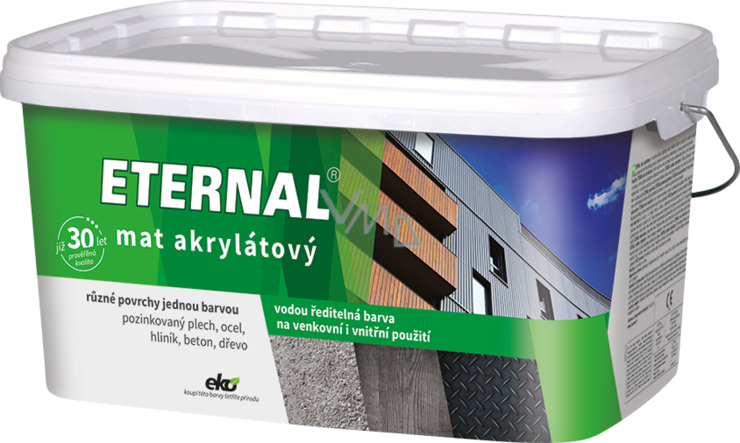 Eternal mat, jedwabnie matowa, wysoce odporna farba do malowania elementów budowlanych i konstrukcji z blachy ocynkowanej, również bez wcześniejszej oksydacji, metalu, niechodzonego betonu oraz drewna, aluminium, miedzi.