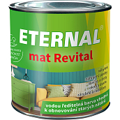 ETERNAL mat Revital to uniwersalna, jedwabisto-matowa woda rozcieńczalna masa malarska do zastosowania wewnętrznego i zewnętrznego, wyprodukowana z specjalnej dysperzji akrylowych kopolimerów, pigmentów, wypełniaczy i dodatków. Tworzy stosunkowo twarde, elastyczne matowe powłoki o wysokiej odporności na niekorzystne warunki atmosferyczne oraz doskonałej odporności na blokowanie, nawet przy wyższych temperaturach. Wyróżnia się bardzo dobrą kryjnością, dobrym rozlewem, szybkim schnącym czasem oraz doskonałą przyczepnością nawet do starych syntetycznych i olejowych powłok. ETERNAL mat Revital spełnia warunki normy ČSN EN 71 część 3 Bezpieczeństwo zabawek Migracja niektórych elementów.