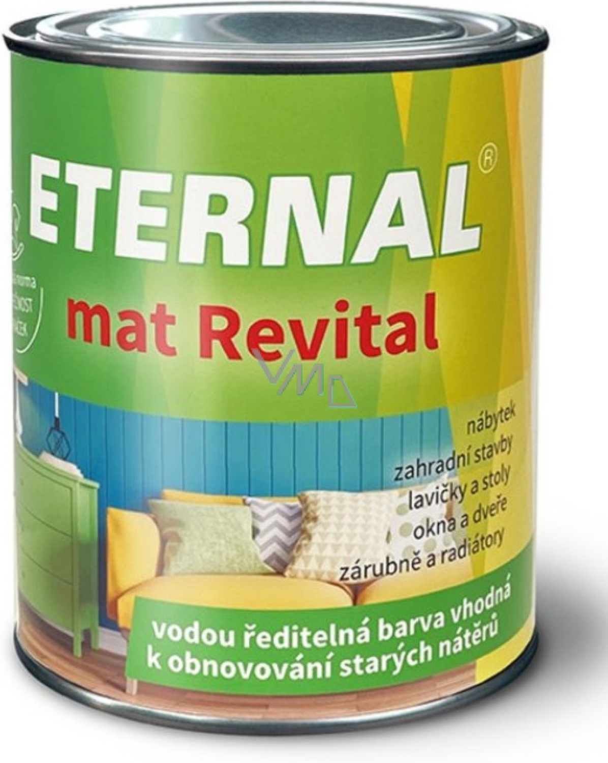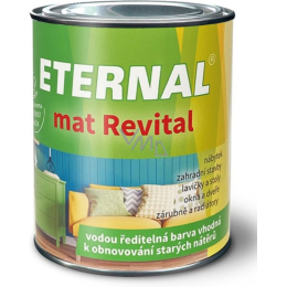 ETERNAL mat Revital to uniwersalna, jedwabisto-matowa farba na bazie wody do stosowania wewnętrznego i zewnętrznego, przygotowana z specjalnej rozpraszającej dyspersji kopolimerów akrylowych, pigmentów, wypełniaczy i dodatków. Tworzy stosunkowo twarde, elastyczne matowe powłoki o wysokiej odporności na warunki atmosferyczne oraz doskonałej odporności na blokowanie, nawet w wyższych temperaturach. Wyróżnia się bardzo dobrą kryjnością, dobrą rozlewnością, szybkim schnięciem oraz doskonałą przyczepnością do starych powłok syntetycznych i olejowych. ETERNAL mat Revital spełnia warunki normy ČSN EN 71 część 3 Bezpieczeństwo zabawek Migracja pewnych pierwiastków.