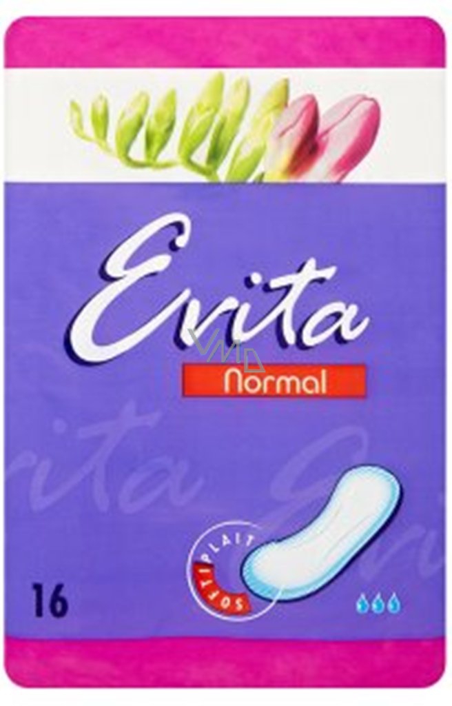 Evita Normal, damskie wkłady higieniczne. Tradycyjne wkłady higieniczne bez boków skrzydełek są pokryte delikatnym włóknem Softiplait, które zapewnia uczucie komfortu i miękkości. Folia izolacyjna zapewnia ochronę przed wyciekiem płynów. Absorpcja: 3 krople. Produkty higieniczne Evita są przeznaczone dla wszystkich kobiet, które doceniają jakość w przystępnej cenie. Dla poczucia świeżości i czystości 365 dni w roku.