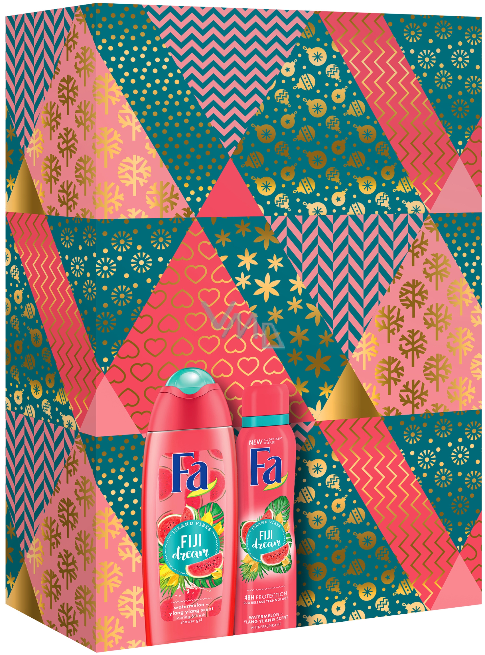 Dárková sada Fa Island Vibes představuje skvělou kombinaci dvou pečujících dárků pro ženy. Sadu tvoří sprchový gel a deodorant značky Fa. Sprchový gel Fa Fiji Dream díky jemné a výživné receptuře pečuje o pokožku, účinně ji čistí a chrání před vysoušením. Dvojici dárků korunuje deodorant Fa Fiji Dream, který ženám poskytne příjemnou dámskou vůni a účinnou ochranu před potem, a to až po dobu 48 hodin. S touto kosmetickou dárkovou kazetou věnujete ženám pocit svěžesti, vůni a péči.