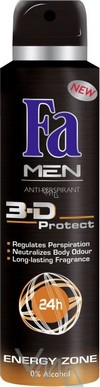 Nová vysoce účinná řada Fa Men 3D zajistí mužům svěží vůni od okamžiku, kdy ráno vstoupí do sprchy, až do chvíle, kdy se na konci dne svalí do postele. Nové deodoranty Fa Men 3D Protect jsou určeny aktivním mužům. Dodávají 24hodinovou ochranu ve třech rozměrech: regulují pocení, neutralizují tělesný pach ještě dříve, než se vůbec začne projevovat, a zajišťují svěží vůni pro dlouhodobý pocit jistoty 24 hodin denně.