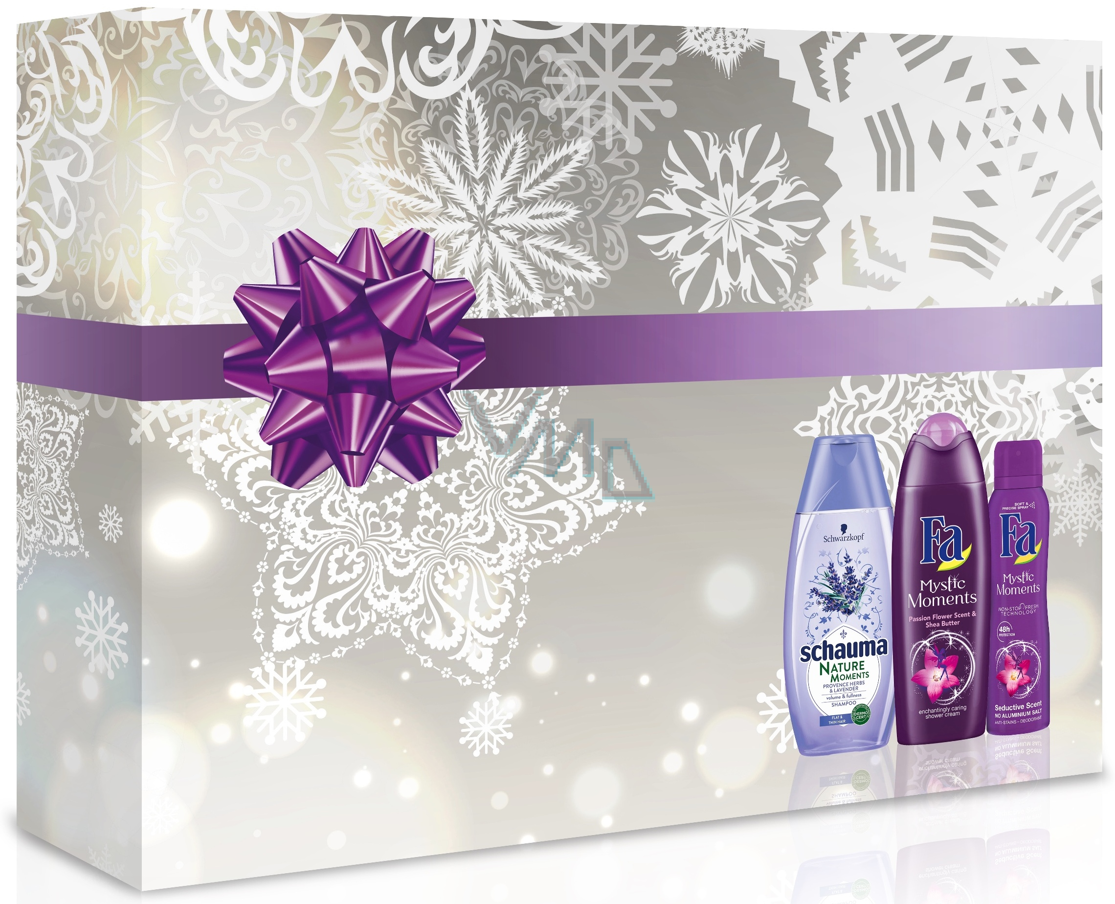 Přemýšlíte o dárku, který potěší vaše blízké? Pak vyzkoušejte dárkovou sadu Fa a Schauma v jednom! Dárková sada obsahuje: sprchový krém Fa Mystic Moments 250 ml, deodorant Fa Mystic Moments 150 ml a šampon Schauma Nature Moments Lavender 250 ml. Všechny produkty jsou navíc zabaleny do krásné dárkové krabičky, takže si nemusíte dělat starost s balením dárku. S touto dokonalou péčí o tělo prostě neuděláte chybu!