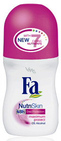 Řada deodorantů Fa NutriSkin pro ženy obsahuje výběr vyživujících vitaminů, jako jsou vitaminy E a F, které pokožku chrání. Vitamin E posiluje obranyschopnost pokožky a vytváří na ní ochrannou vrstvu. Vitamin F pak podporuje přirozenou funkci pokožky. Speciální estery z olivového oleje tuto obranyschopnost podporují a chrání jemnou pokožku v podpaží před poškozením. Další vyživující látky pomáhají zachovat dokonalou rovnováhu pokožky.
