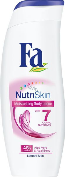 - Tělové mléko Fa NutriSkin s mlékem z aloe vera a plody acai – poskytuje normální pokožce 48hodinovou hydratační péči. Mléko z aloe vera má hloubkové vyživující a hydratační účinky a neobvyklá, inspirující vůně plodů acai zahalí vaše tělo a promluví k vašim smyslům.