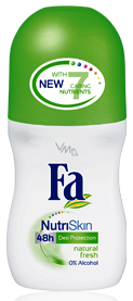 Řada deodorantů Fa NutriSkin pro ženy obsahuje výběr vyživujících vitaminů, jako jsou vitaminy E a F, které pokožku chrání. Vitamin E posiluje obranyschopnost pokožky a vytváří na ní ochrannou vrstvu. Vitamin F pak podporuje přirozenou funkci pokožky. Speciální estery z olivového oleje tuto obranyschopnost podporují a chrání jemnou pokožku v podpaží před poškozením. Další vyživující látky pomáhají zachovat dokonalou rovnováhu pokožky.