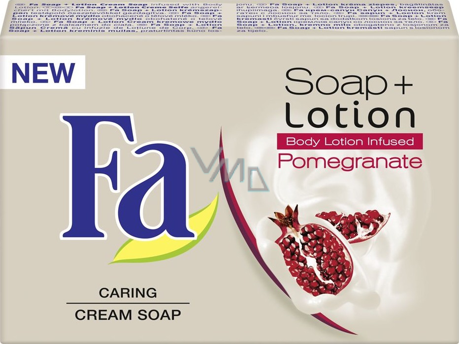 Objevte neodolatelný pocit hebké pokožky s Fa Soap + Lotion Granátové jablko. Toaletní mýdlo obohacené o tělové mléko šetrně umývá Vaše ruce a zanechává je jemné a hebké. Vůči pokožce pH neutrální. Dermatologicky ověřená snášenlivost s pokožkou.