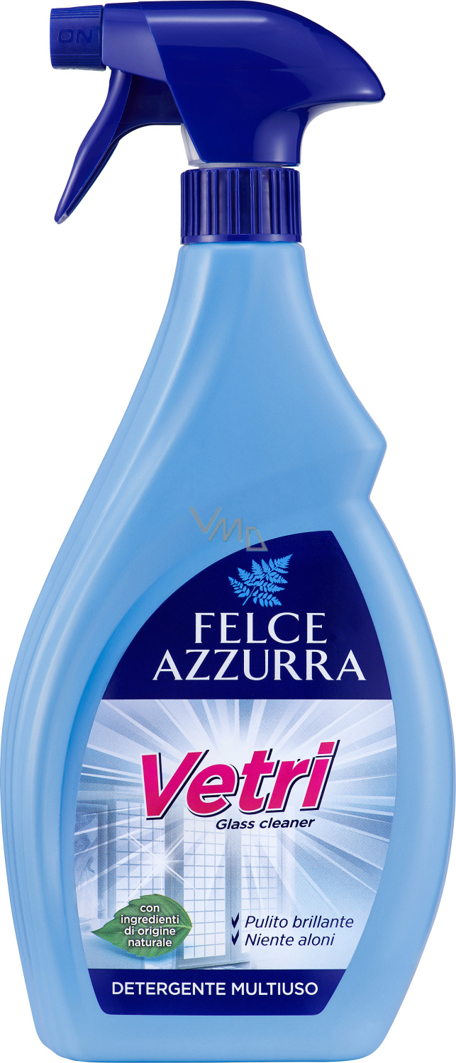 Markowy włoski środek do mycia okien Felce Azzurra. Produkt doskonale radzi sobie z usuwaniem wszelkich zanieczyszczeń z powierzchni szklanych. Ma przyjemny zapach, nie pozostawia smug. Skład szanuje środowisko, ponieważ zawiera oryginalne składniki naturalne. Przetestowany dermatologicznie. Importowany z Włoch