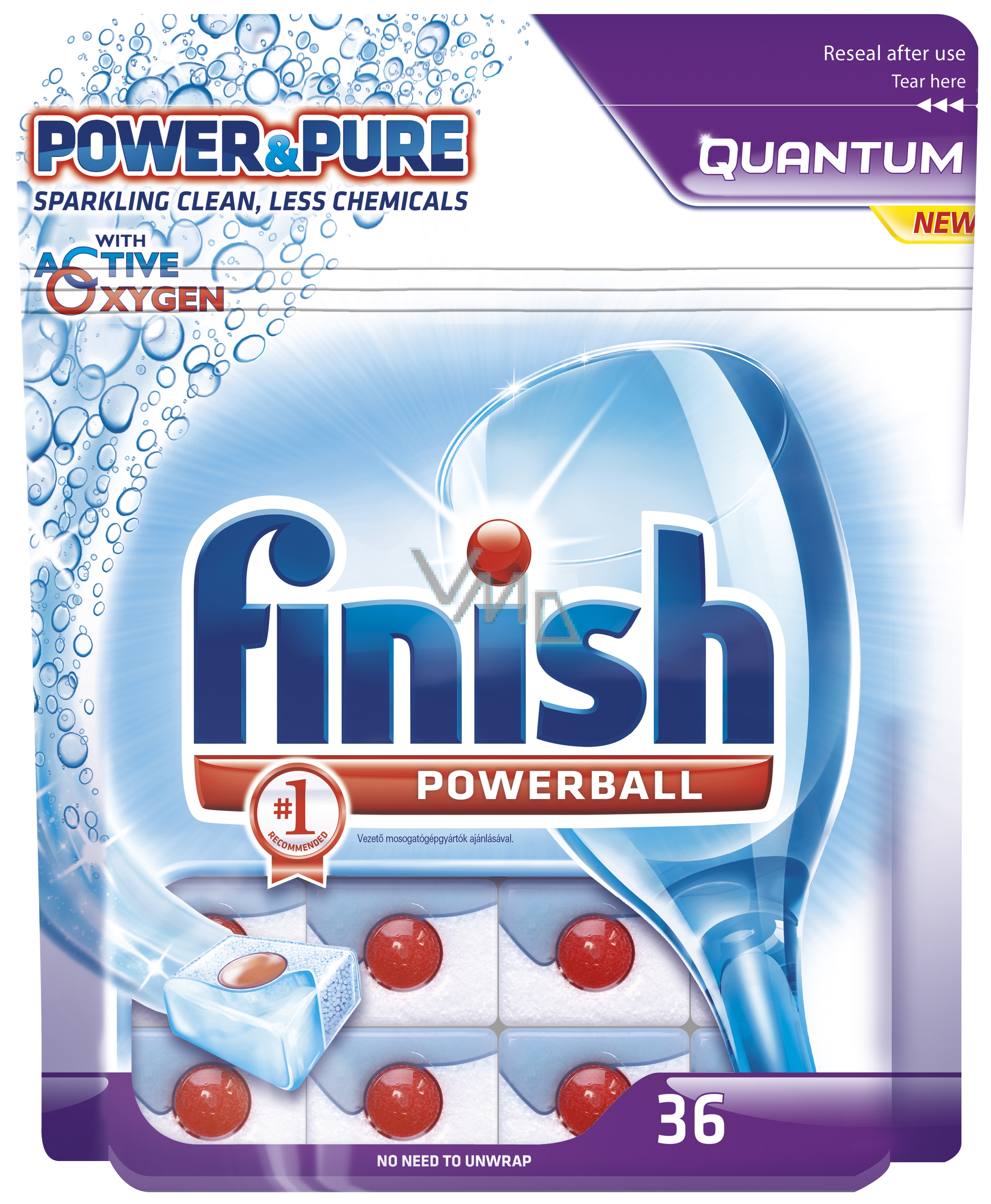 Finish Quantum Powerball Power & Pure zářivě čisté nádobí a méně chemikálií. Naše nové složení obsahuje Active Oxygen, který likviduje nečistoty i v těch nejtěžších podmínkách. Náš pěnící PowerBall uvolňuje čistící částice, které zajistí dokonalou čistotu, kdekoliv je potřeba.