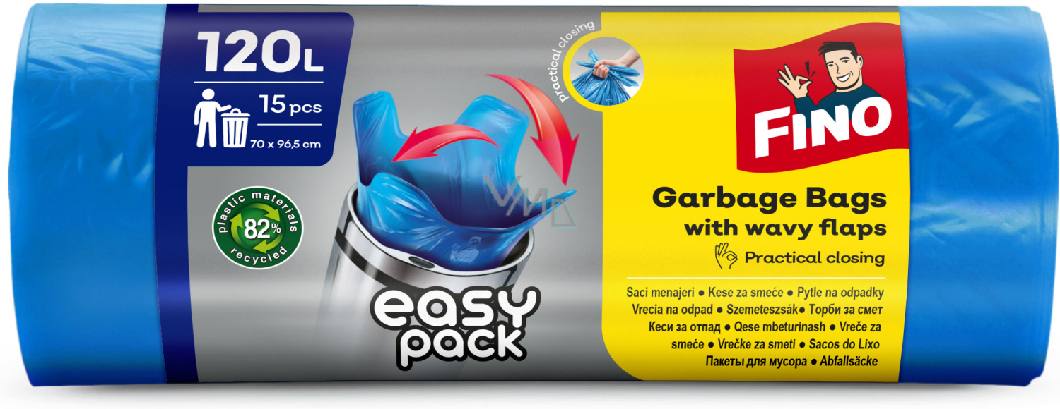 Kvalitní pytle značky Fino, ideální pro objemné odpadkové koše. Mají praktický vázací uzávěr („Easy Pack).