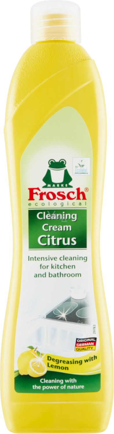 Świetnie usuwa wszystkie rodzaje zanieczyszczeń, takie jak tłuszcz, resztki mydła i kamień wodny z wszystkich ceramicznych, emaliowanych, stalowych i szklanych powierzchni. Działanie czyszczące i odtłuszczające produktu Frosch Krem czyszczący Cytrynowy zapewnia drobno mielony naturalny wapień oraz wyciąg z cytrusów. Zostawia długotrwały świeży zapach cytrynowy. Nie używać na powierzchniach z tworzyw sztucznych, np. akrylach lub plexiskle.
