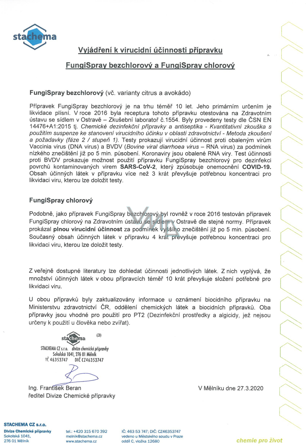 Preparat FungiSpray bezchlorowy jest na rynku od prawie 10 lat. Jego głównym przeznaczeniem jest likwidacja pleśni. W 2016 roku receptura tego preparatu została przetestowana w Instytucie Zdrowia w Ostravie - Laboratorium Badawcze nr 1554. Przeprowadzono testy zgodnie z normą ČSN EN 14476+A1:2015 tj. chemiczne środki dezynfekcyjne i antyseptyki - Badania ilościowe z wykorzystaniem zawiesiny do określenia działania wirusobójczego w obszarze ochrony zdrowia - Metoda badań i wymagania (faza 2 I stopień 1). Testy udowadniają wirusobójcze działanie przeciwko wirusom otoczkowym Vaccinia virus (wirus DNA) oraz BVDV (Bovine viral diarrhoea virus - wirus RNA) w warunkach niskiego zanieczyszczenia już po 5 min. działania.