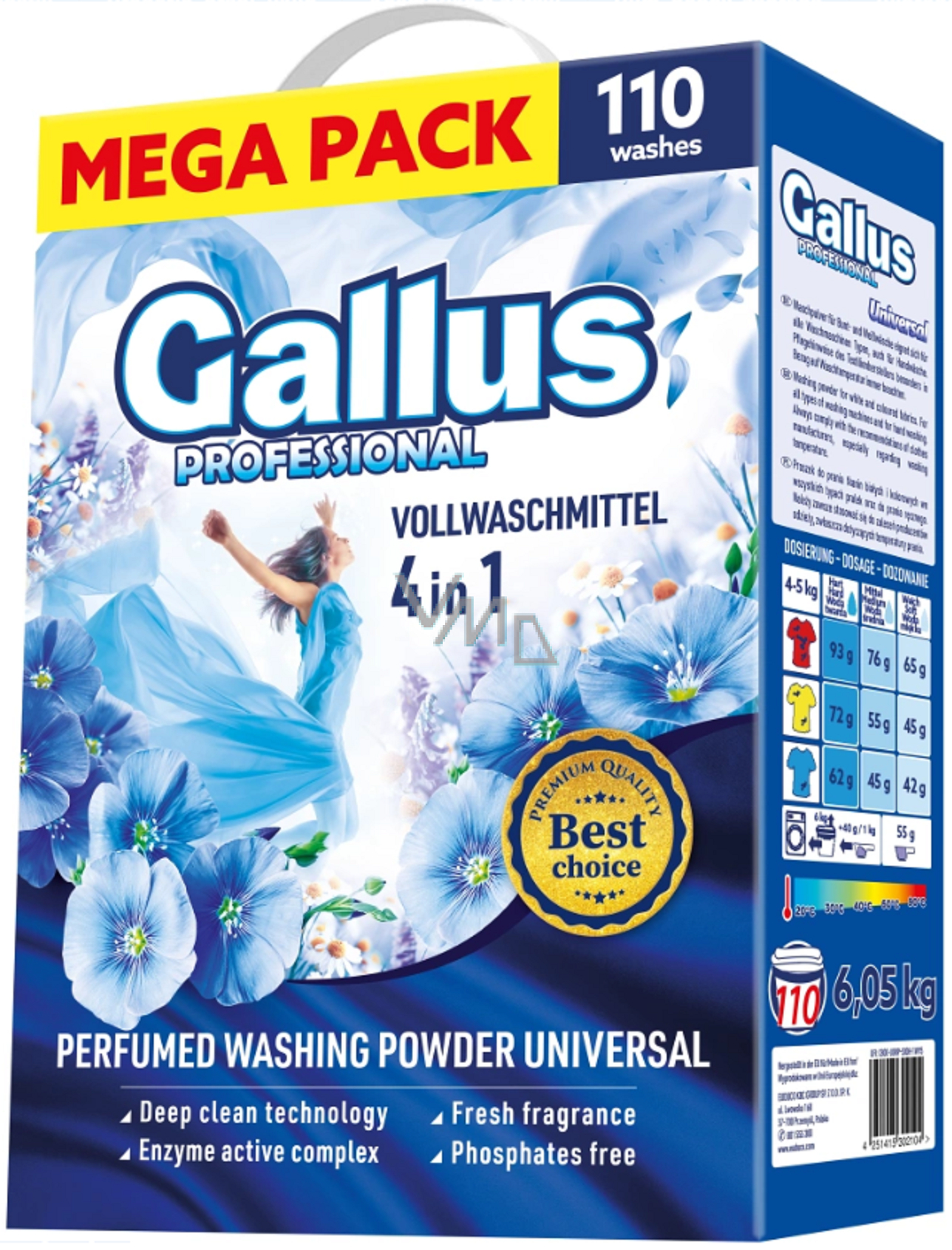 Univerzální prací prášek Gallus nabízí vynikající poměr cena/výkon. Je vhodný na běžné každodenní praní barevného, bílého i černého prádla. Spolehlivě odstraní nečistoty a skvrny už při 30 °C a zároveň chrání vaši pračku před vodním kamenem.