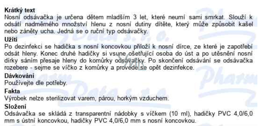 Nosní odsávačka hlenů: Transparentní nádobka s víčkem (10 ml), hadička PVC 4,0/6,0 mm s ústní koncovkou, hadička PVC 4,0/6,0 mm s nosní koncovkou, spojovací kužel a hadička 900 mm s nástavcem na vysavač.